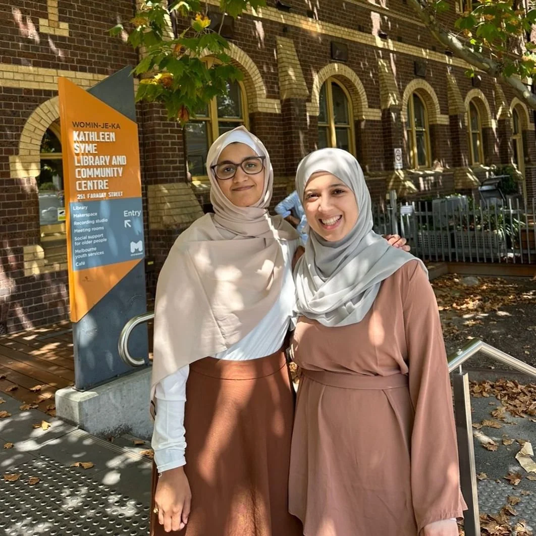 Summayah (left) and Israa after a Wellbeing Workshop. Sumayyah currently volunteers as the Student Wellbeing Officer.